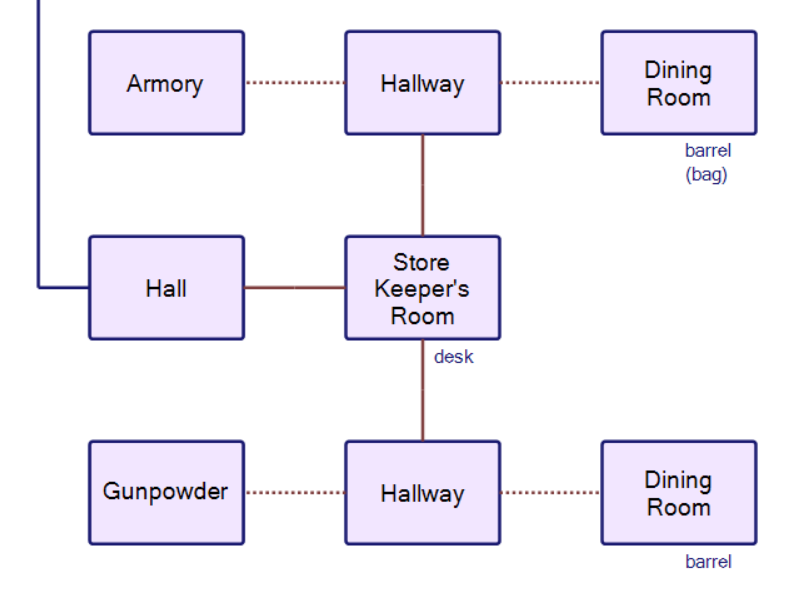 There’s a “sack” with some supplies you can grab at the dining room, but otherwise this area involved not only tediously checking each object with all my relevant verbs (look, search, move) but also tediously unlocking and opening doors as required. When there’s multiple locked doors, the process is…