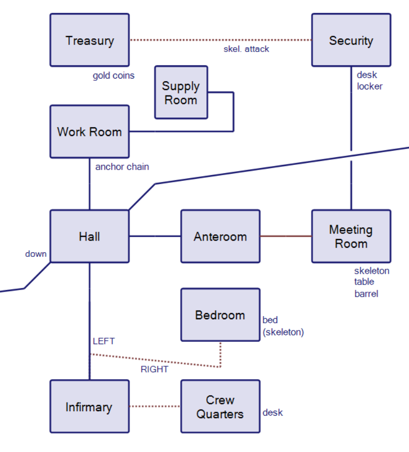 The cross is important because back at the same level as the infirmary there’s also a treasury (the key back in the captain’s room globe opens that). There’s a skeleton there that tries to kill you, and this is the only “active” menace in the game. I was stuck for a while here because not only did I not have the cross found yet (leading me to test a bunch of “amen” variants and methods of fighting like with the cannonball, no luck), but the exact parser command to type was elusive. You need to throw the cross.