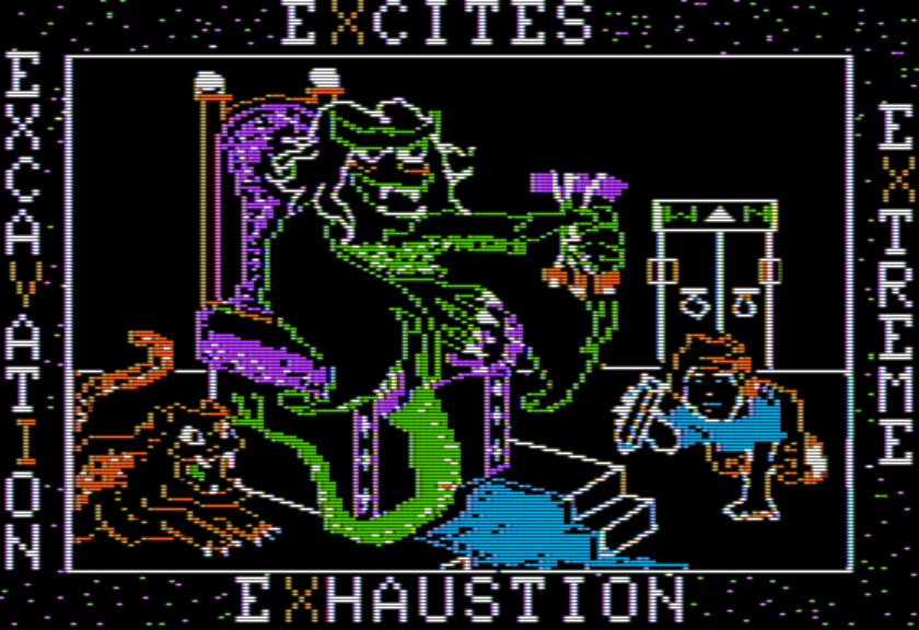 The colors have their usual Apple II muddy effects going on so I can’t be certain, but I think the “A” on the page bottom is the only place a letter is colored yellow. (The anagram here, by the way, is Uanna, the name of the dog. The name is so unusual surely it is a significant clue? The review I mentioned earlier thought the dog’s name was Vanna, but cross checking a word starting with “V” later indicates the game definitely meant Uanna.)