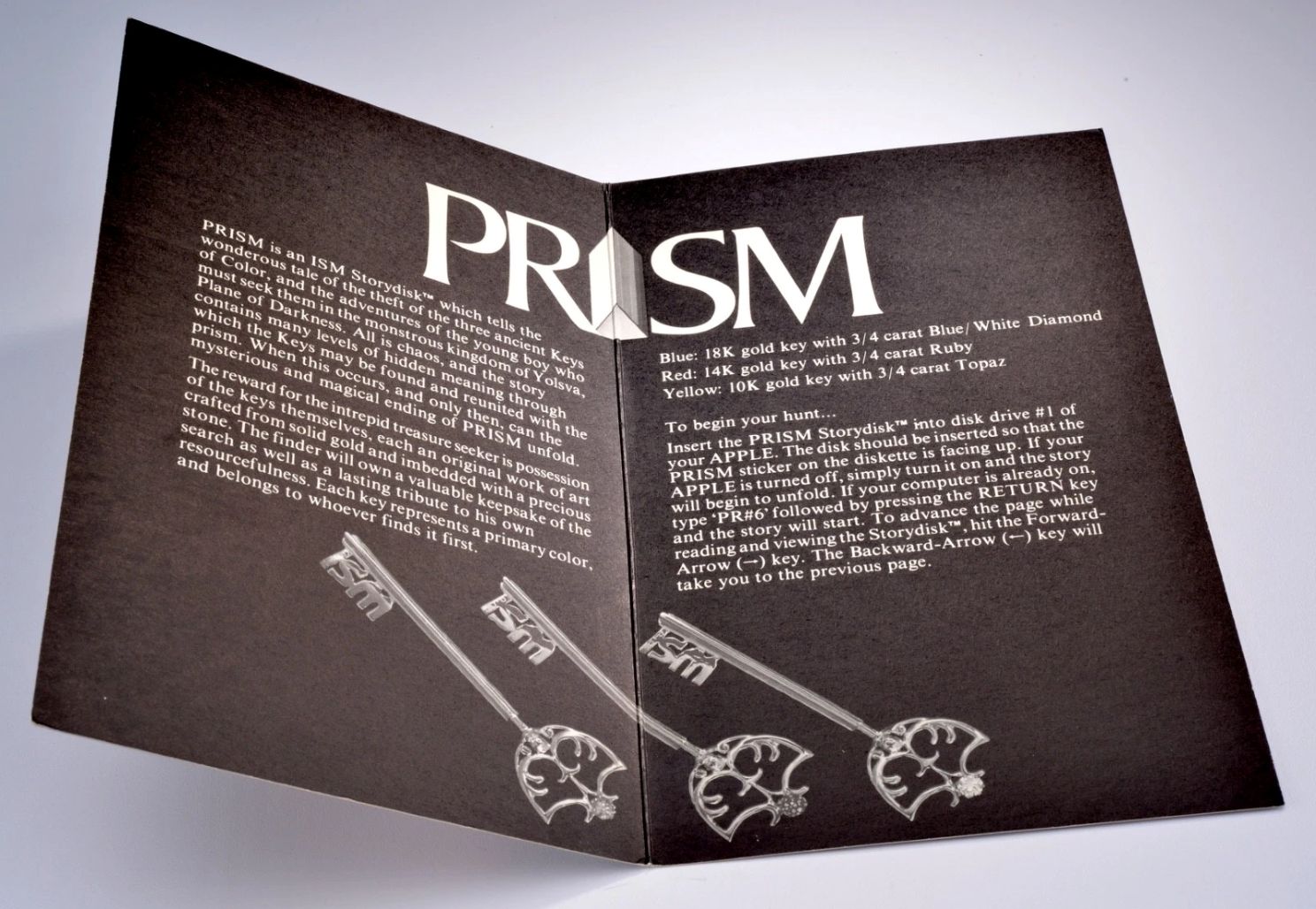 PRISM is an ISM Storydisk which tells the wonderous tale of the theft of the three ancient Keys of Color, and the adventures of the young boy who must seek them in the monstrous kingdom of Yolsva, Plane of Darkness. All is chaos, and the story contains many levels of hidden meaning through which the Keys may be found and reunited with the prism. When this occurs, and only then, can the mysterious and magical ending of PRISM unfold.