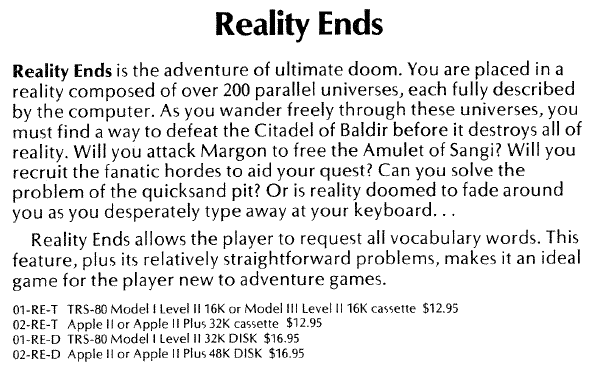 My first encounter with Reality Ends was the clip above, via the Med Systems Spring 1981 Catalog. The “over 200 parallel universes” bit definitely had me puzzled until I opened the game itself.