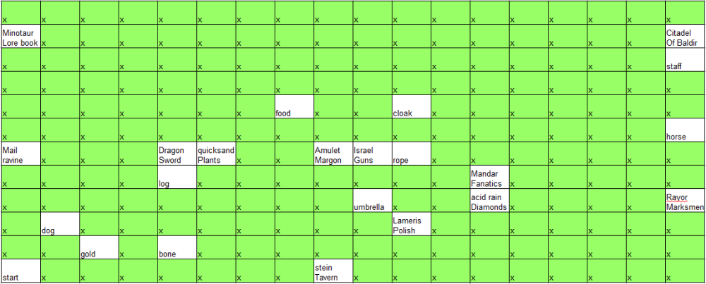 The game is entirely on a grid 12 rows high and 18 columns across. You start in the lower left corner and the endgame (the Citadel of Baldir) is 1 room down from the upper right corner. Starting from the beginning and going east, the room descriptions look like this: