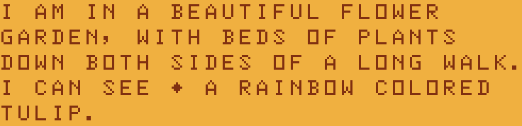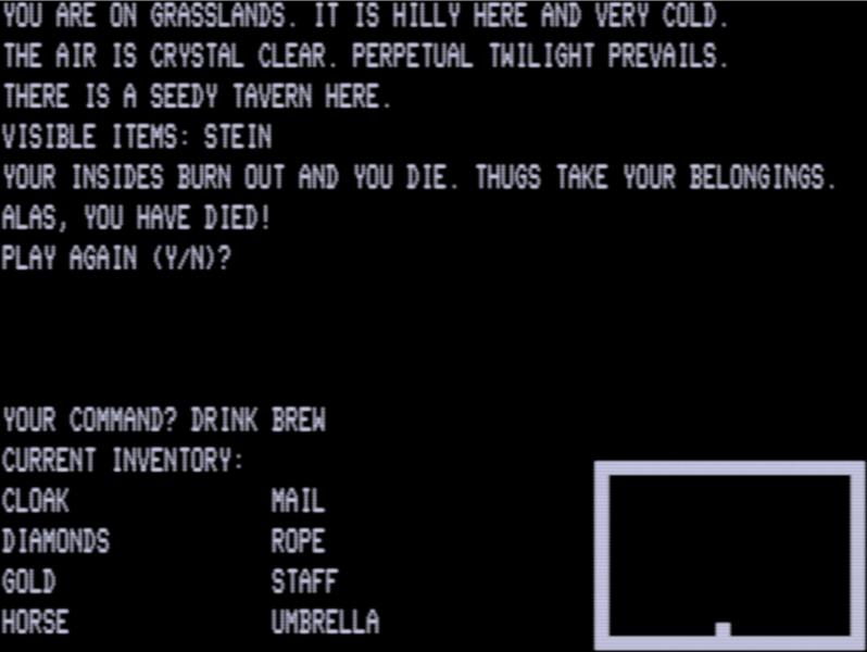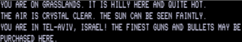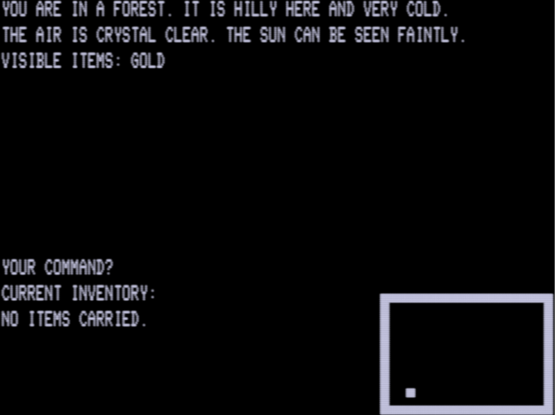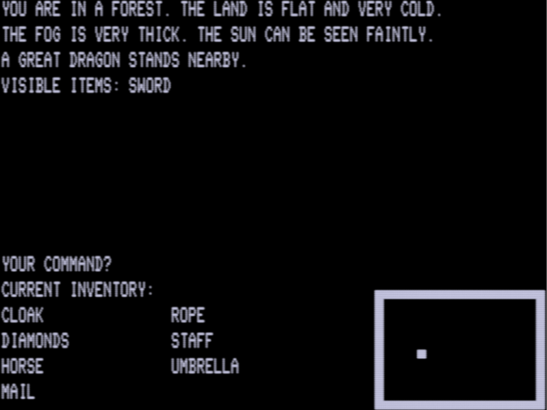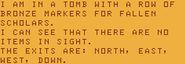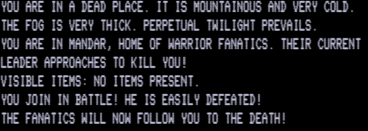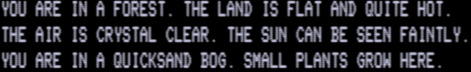 Theoretically, really quite something for 1980! In practice … well, the landscape description is unimportant to gameplay, so I fairly quickly started to ignore all the description text. Still, I would call it a worthwhile experiment.