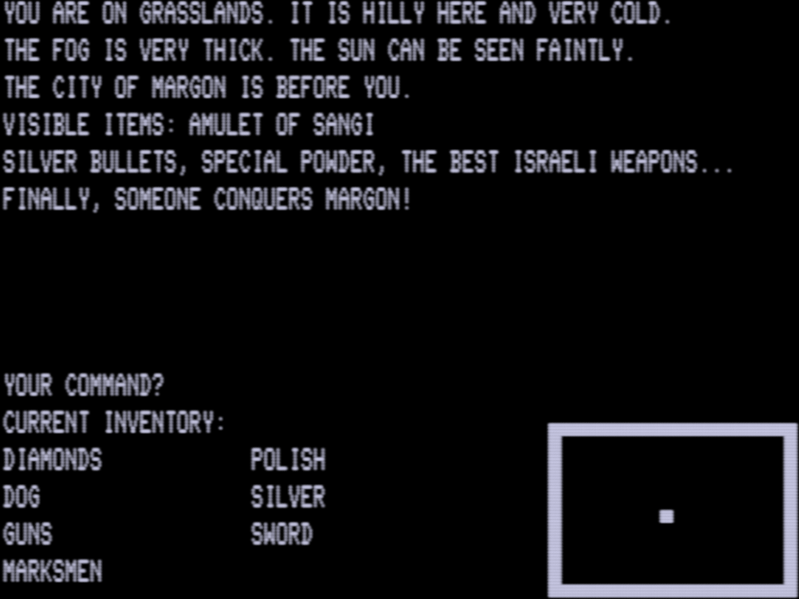 Besides the map, I haven’t made much progress other than a few early pick-offs. I got food and did >FEED DOG to get a loyal companion, I went to >HIRE MARKSMEN and managed to >USE GOLD to get them to follow me around, and I used an umbrella to fend off some acid rain and pick up some diamonds. Technically speaking, the game doesn’t seem like it has to be a long one (excluding rooms with just objects out in the open, there are only twelve of significance) but we’ll see what kind of new frustrations this can conjure up.
