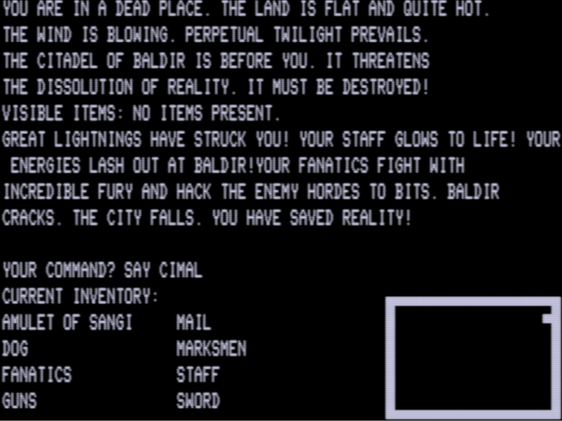 Let’s skip ahead a bit: once you get the Amulet of Sangi, you just need the fanatics (that I mentioned earlier), a staff (which happens to be sitting on the ground next to the endgame room) and a magic word CIMAL (which you can get by stealing a book of lore from a minotaur). Then it’s just a matter of going to the CITADEL OF BALDIR which threatens the DISSOLUTION OF REALITY and letting fury reign: