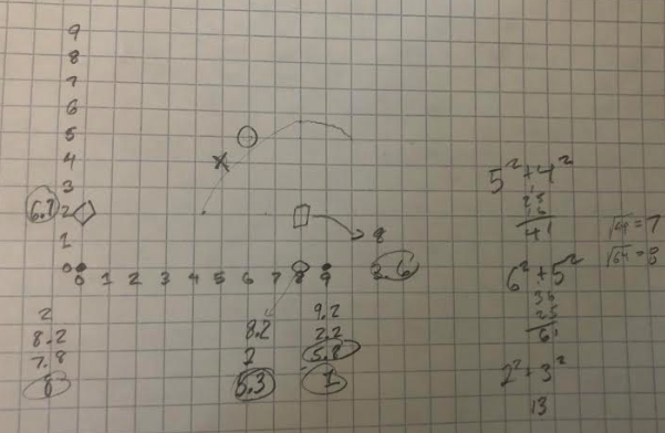 My first runs just had me picking points by instinct. I noticed, generally, that when the distance didn’t have a decimal point involved, the hidden player was on the same row or column as my guess. I say “generally” because there is a little wrinkle: the system rounds to the tenth, but always rounds down. For instance, the points (0,0) and (5,1) are approximately 5.099 units apart (just using the Pythagorean Theorem) if you are 5-and-1 away from a target the game will say you’re a distance of 5.