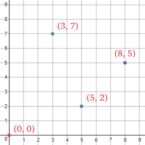 The grid is the first quadrant of the Cartesian coordinate system, with (0,0) in the lower left of the grid. More sample points are below:
