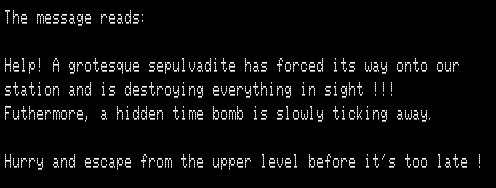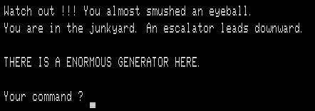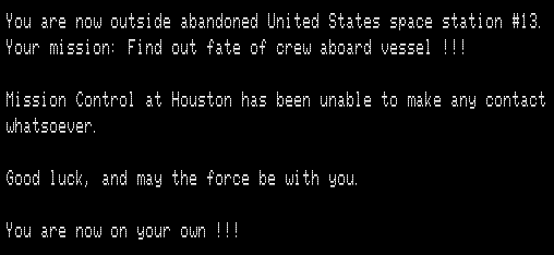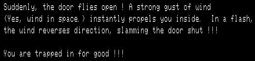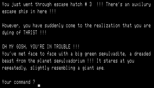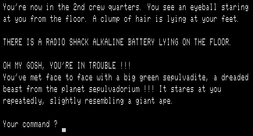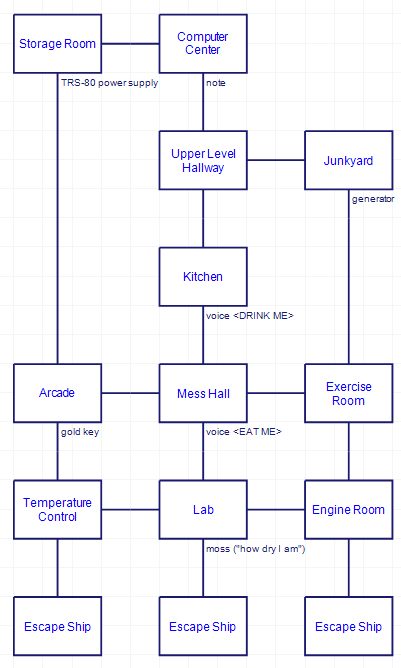 The second floor has three escape ships. The goal (according to the source code) is to find the correct one of the three ships, TURN ON / SHIP, and fly to victory. I’m saying “the source code” because I never quite managed it, possibly due to a bug.