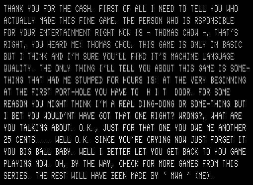 Before the game proper even starts there’s an “intro” file which gives credit to a “Cord Coslor” in addition to Chou, asks the player PLEASE INSERT 25 CENTS and prompts the player to type the number 25, and then has a long screen before the game proper starts.