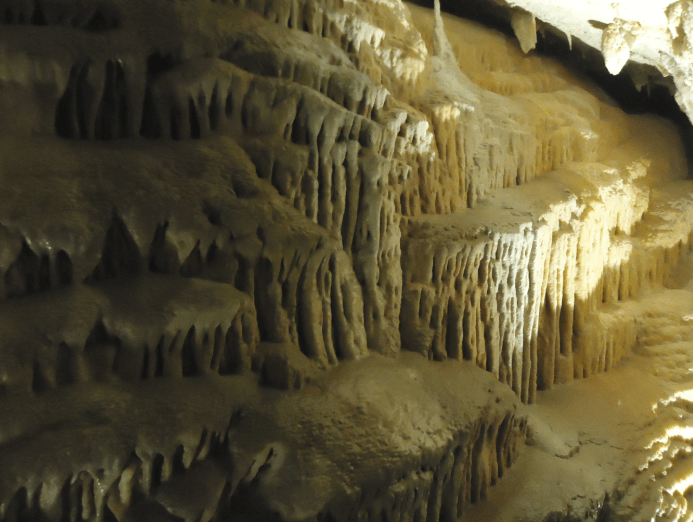 There is a large rimstone dam here. Behind it, a pool of water spills steadily over the dam. The ceiling dips into the pool.