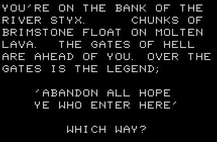 Dante’s Inferno was a type-in by Gerard Bernor printed in the January 1980 issue of Softside which tasks you with stealing your contract with the devil from Hell itself. (It states a 1979 copyright date in the source code, so 1979 also works as a date, but I’ve found no evidence of a commercial release prior to the magazine appearance so I’m listing this game as 1980.) The print copy called it a “CompuNovel”, a term used very sporadically elsewhere (ex: page 5 of this February 1980 issue of Softside in an ad for Lost Dutchman’s Gold) and one that died out by 1981.