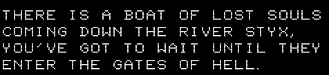 I did find this more enjoyable than Quest, insofar as that the genre of a journey through Hell made the idea of a torturous labyrinth with slightly random layout thematically appropriate. There were a lot of “dead ends” (an easy way for the author to add map locations without having to add extra room descriptions) and there was the usual “going one direction and then going back the opposite way may not take you where you started” business, but all this worked well with the atmosphere.