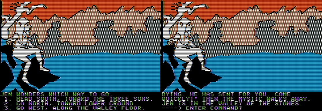 Of course, this is a game which isn’t even trying to have puzzles. It was rather harder for people at the time to imagine what a “crunchy” game would be like with a menu system (Kadath pulled it off but had a wild navigation gimmick that wouldn’t work elsewhere). At least Sierra didn’t drop the notion, as the Sunnyside crew followed up with Troll’s Tale in 1983. Perhaps the most interesting use was taking the text-parser game The Dark Crystal (published early 1983) and converting it for a menu system in Gelfling Adventure.