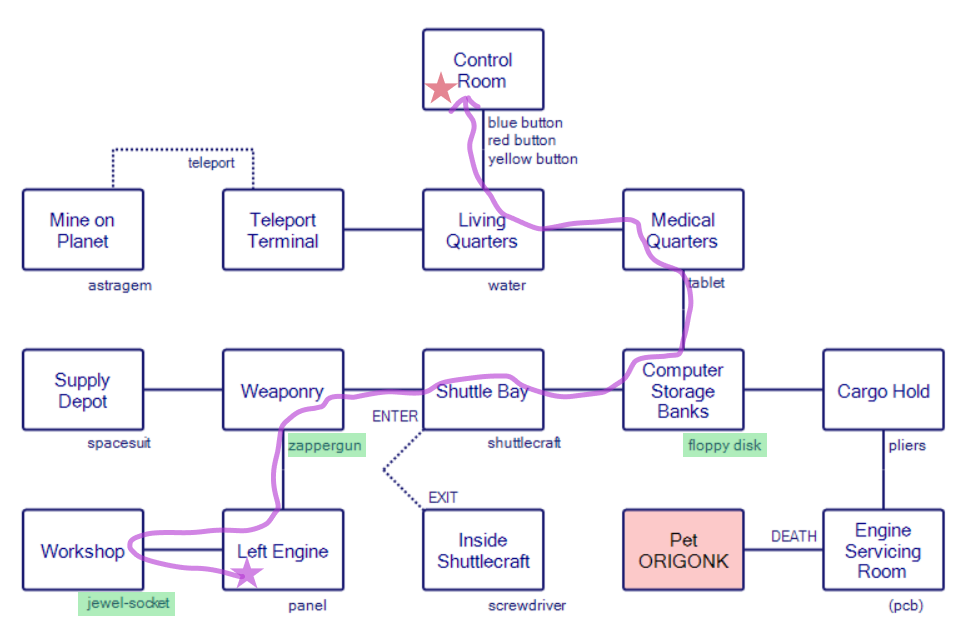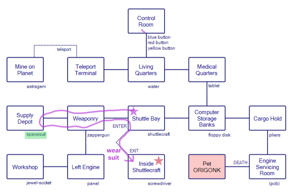 To the south are some “computer banks” with a floppy disk — I’ll deal with that later — and then heading eastward leads to a Cargo Hold (with pliers) and an empty Engine Servicing Room (where going any farther is death, due to a “pet origonk”).