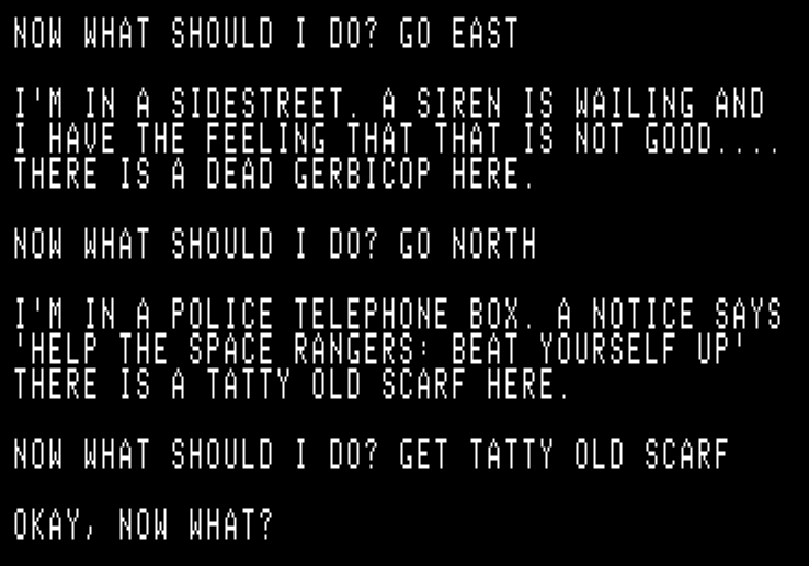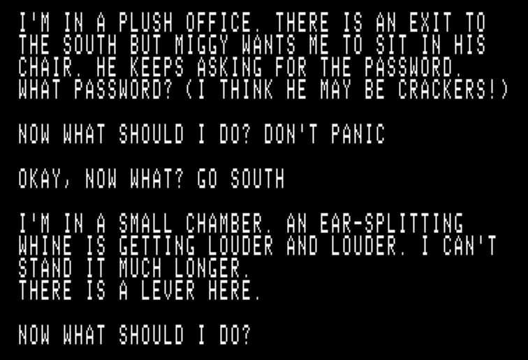 Not even described! But there’s a DEAD SPACE RANGER here now. This opens a route to a the offices of TEMPORAL TRAVEL CORP and a PLUSH OFFICE where you’re asked for a password. This is where the earlier message about Spike is useful: at the beginning of the game, he gave the advice DON’T PANIC.