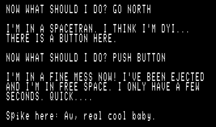 This is written from the avatar’s perspective in a concise way that nonetheless avoids the weirdly distorted minimalism of Scott Adams and related games; they’re sentences a person would actually write normally. The subjective confusion of the protagonist is really the thrust of the narrative, and Spike’s interjection, while cliché, still drips an injection of character. In other words, the game has description that matches the ludic action/plot and interplay between two personalities, not counting that of the player themselves. Not what I expected at all from a system with 8K of memory and 1Mhz of speed.