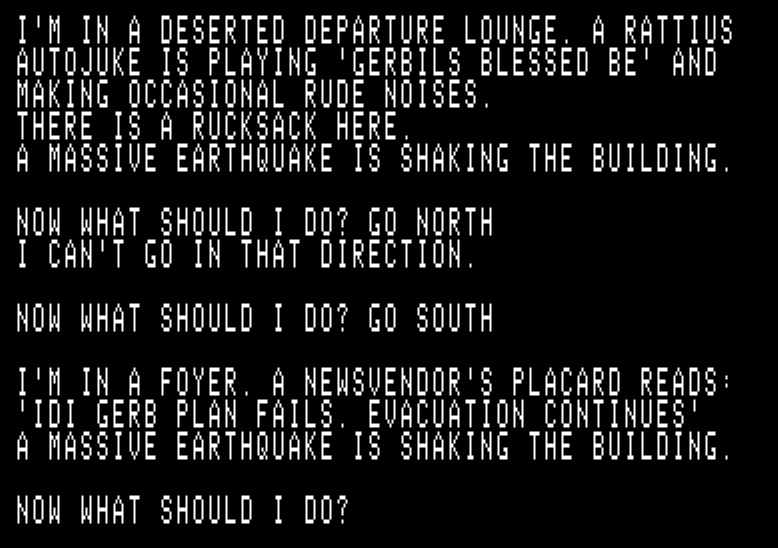Still, this game is far better than it ought to be. I’d very tentatively recommend it (instructions are in this post although before you play you first need to do a “Cold start”, type “8192” when it ask memory size, and 46 when it asks terminal width, then double click RESET to restart the system — then you can pick up the instructions from there) although a port to something easier to work with would bump it up to … well, still only tentatively recommended. It has problems. But there are parts (likely partly spawned by often not worrying about describing exits) where the writing approaches something Good.