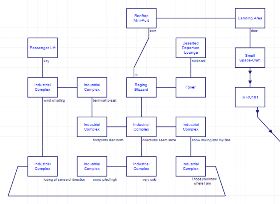 This was me mapping things out; again, the room exits are generally left out, so there’s no way to know GO NORTH won’t work without testing it.