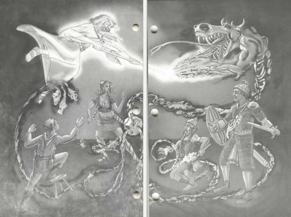 There is little traveling in this time before the harvest, and a new face arouses much suspicion. Some say the barbarian seeks revenge upon a man with a quarter-moon scar on his left cheek. Others say he’s a professional bandit specializing In the exotic: the left hoof of the centaur, the lost crown of the Faerie King, the eye of the stingbat, and the like. And still others say he seeks to give up his present occupation as fighting man and find something more peaceful, perhaps as an artisan’s or baker’s apprentice. A few insist he flees memories of a lost love.