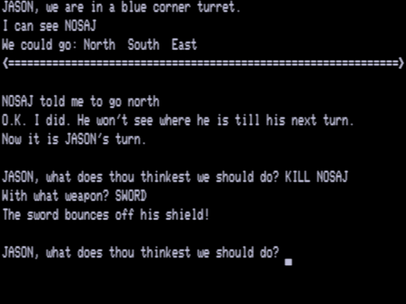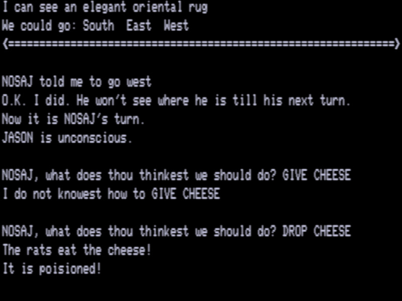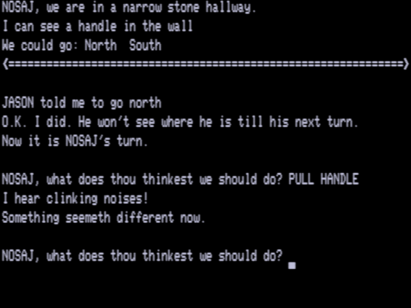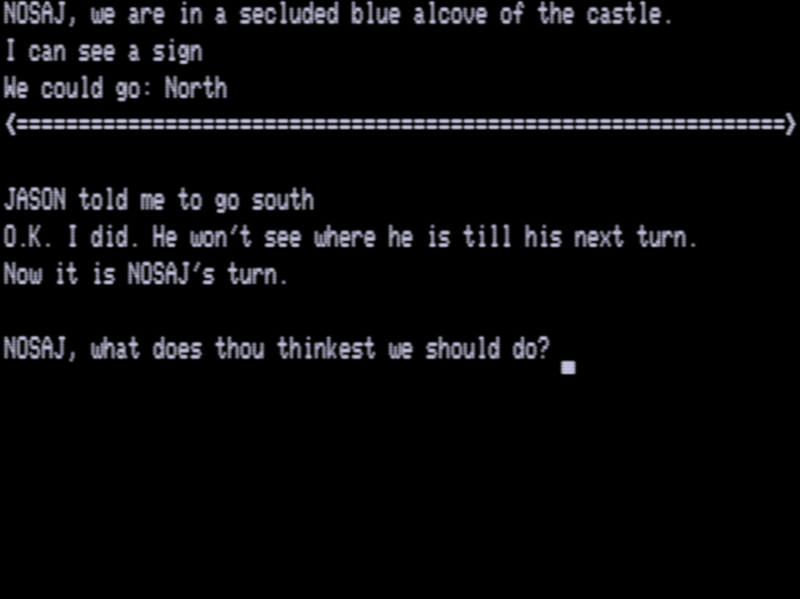 Zyll (a 1984 game) handled this by having all info displayed on screen halves, so a crude “divider” of sorts could be devised, but even with weird contortions here I’m just not sure an elegant solution. Also, wrestling up a friend to play a dodgy TRS-80 text adventure is not as easy as you’d think, so I just tackled this one solo, controlling both players.