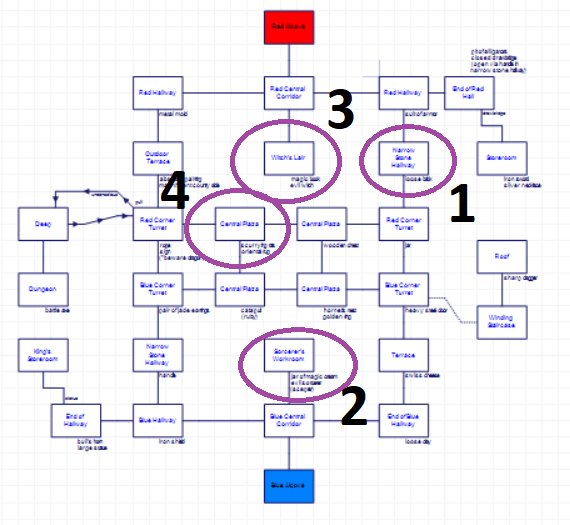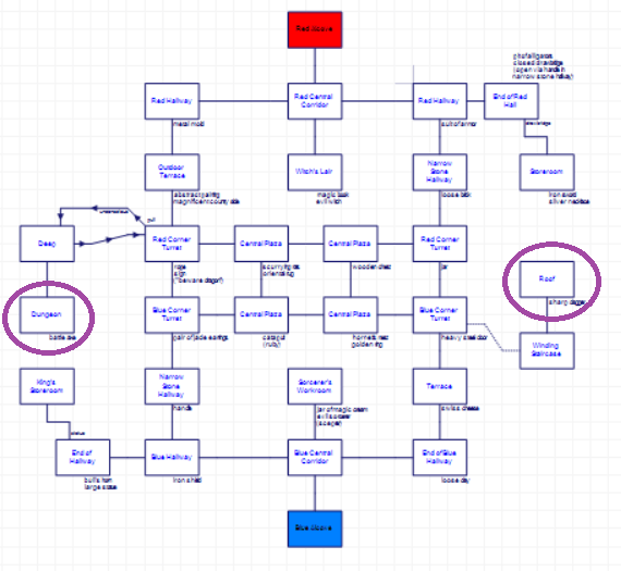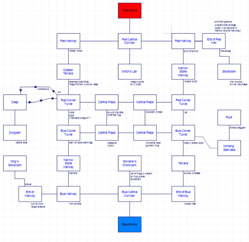 While the rooms are symmetrical, the puzzles and objects are not. There is some sense of trying to make sure elements from both the red and blue sides are required for certain things. For example, there’s a “metal mold” and some “clay” that can combine to MAKE KEY. I’ve marked them on the map below; in this case they are positioned symmetrically.