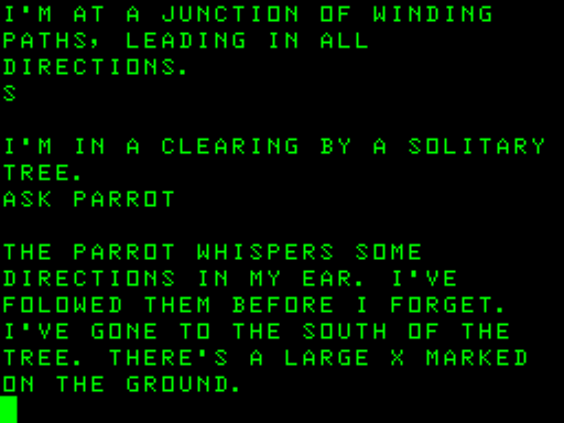 I took the parrot over to a suspicious-looking tree and typed ASK PARROT.