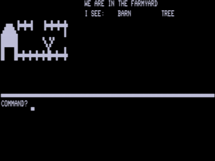 As you can see from the clip, the graphics are fairly unique; a TRS-80 character mode illustration in the upper left, objects and room name to the right, commands on the bottom.
