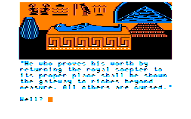 This explains how miserable the game is to communicate with otherwise, including the hellish bit in the pool. We’re getting there. Using DISMOUNT on the camel we make it to a pyramid with a carving. Examining the carving reveals a pharoah holding a scepter, that we can refer to separately.