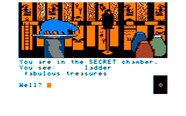 No expansion. Did he mean the parser, or the plot actions? Both feel a little undercooked — we go underground, we find a treasure, we leave, and the actions are elaborate more because of the opening maze and riddle-verb parser rather than any kind of complex puzzle-solving you might expect in an Egypt-themed game. Compare with Temple of Bast which had an ancient curse that had to be outwitted in two different ways.
