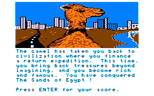 I guess both The Sands of Egypt and Infidel have one similarity, in that the authors were unhappy with the result. Berlyn mentioned in an online conference he “hate[s] the game” (that is, Infidel; I enjoyed it but it’ll have to wait until 1983) and in that same interview where Bjork talked about infusing an arcade sensibility into adventures, he said: