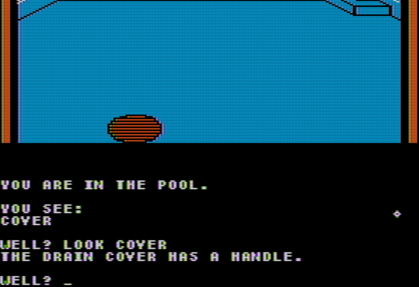 Now, we get to the horrible terrible part. You can GO POOL, and to get out, CLIMB STEPS (as mentioned by 4am). The handle of the cover that we can use to drain the pool is described as a “hook”, and the scepter is also described as a “hook”. Quite obviously the two go together. But how? Switching to Apple just for 4am (and also I switched to Apple now when I got stuck so this is the actual screen I saw):