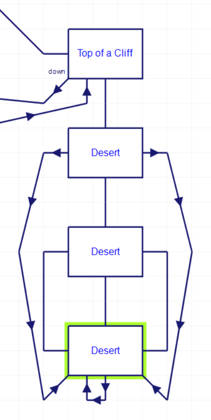 The “down” and “west” exits lead to two different branches of desert. I started with the down branch in my gameplay but the west branch is the more useful one sequentially, so let’s go that way first.