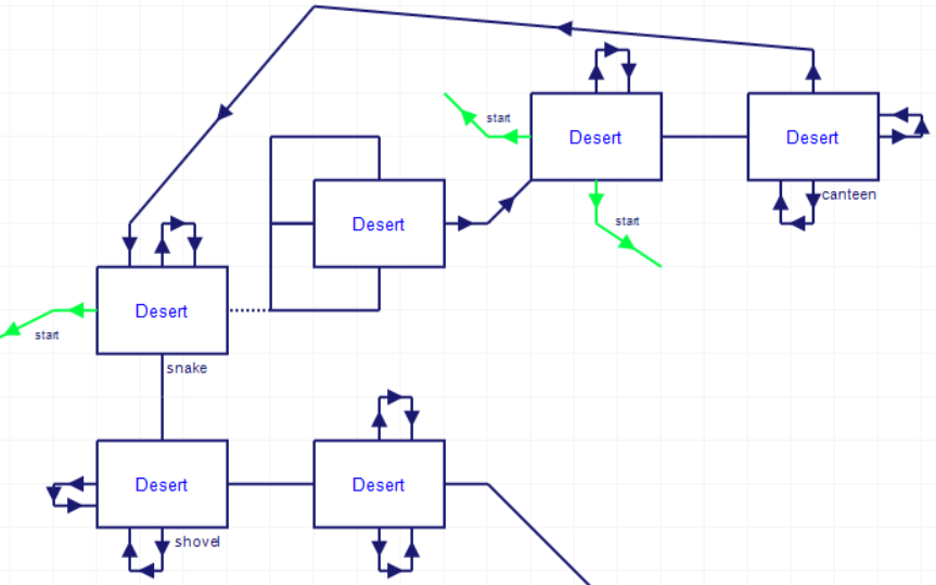 We start in what looks like an open desert. It is not an open desert. It is a fairly finicky maze. This was non-trivial to get over — I’m used to desert mazes always having some open-grid sense to them even if they get maze-like on the edges (like the trackless desert in Adventure Quest).