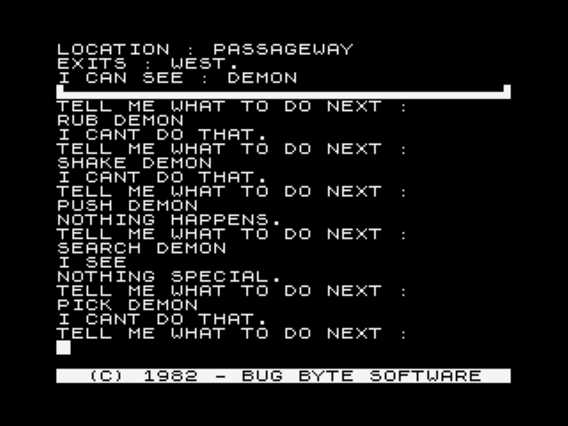 One of the puzzles causing issue was a giant web with a spider. Any direct attack on the spider was ignored; the spider equally ignored the player in their efforts to kick, push, tickle, etc. in the hope of something, anything to happen.