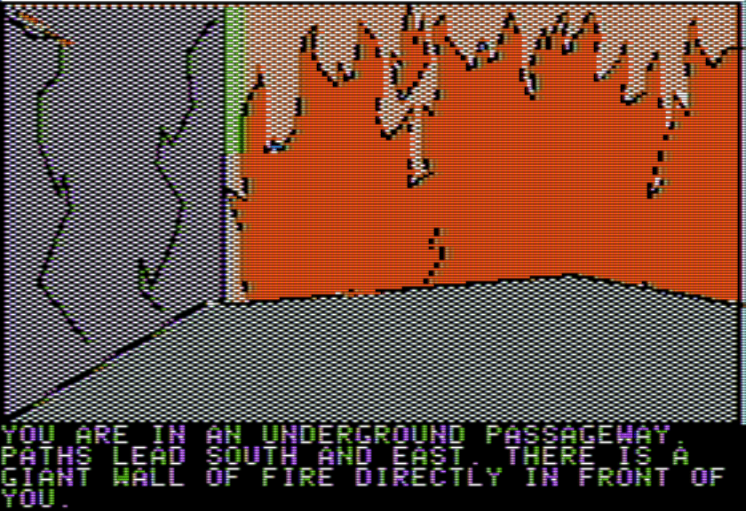 I tried various permutations of using the water from the spring I gathered earlier, but no dice. The wine is the key here: you can POUR WINE followed by ON ME to sufficiently drench yourself to survive the fire … somehow … by magic?