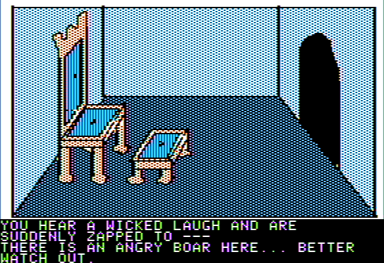 … and occasionally the wizard would ZAP me over to another room. (I liked the flavor here – it led to an “active antagonist” without having to code in all the bells and whistles of an actual moving NPC.)