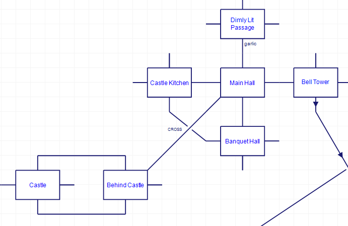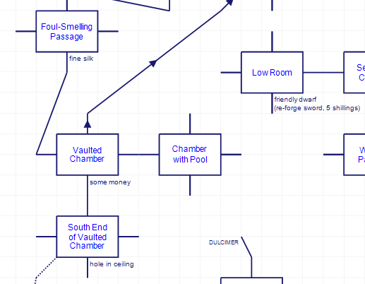Backing up a little, one of the things I did in Madness in the Minotaur that I now believe was a mistake was to keep iterating on new random layouts for too long before settling on a “final map”. This time I saved my game immediately on my first attempt and kept going to that save, with all the objects already in their places (there’s still at least a little randomization done mid-game, which I’ll get to). This meant I could treat item locations as normal and immutable on making a map. I may still find something in the layout is impossible to reckon with later, but for now I feel like I’ve had a lucky draw, especially given the dragon from last time. Remember I died in two steps? This time I bought a sword and tried my luck, and managed to slay it.