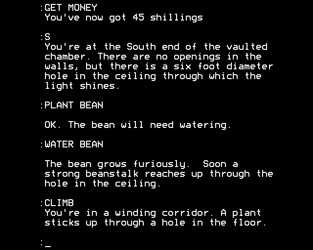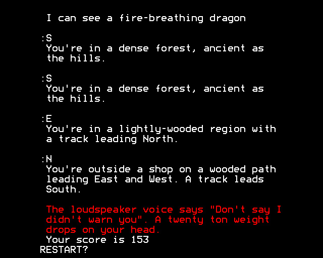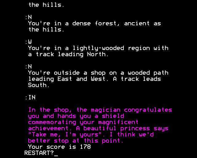 The funny thing is, of course, that isn’t really a bad thing! This is essentially the most playable of Paul Shave’s games. It mimics Adventure a little too much for me to call it top-tier, but I did enjoy seeing how randomization fiddled with gameplay possibilities, and I’m guessing there are some emergent stories that I’ve missed based on, say, possibly having a sword break at an inconvenient moment. (Weirdly, in my final run I didn’t meet any dwarves — I wonder if that has something to do with me trapping the dragon in the forest.) I’d say the adventure-roguelike aspect (which I’ve chronicled a number of failures of) actually works here; just the right elements are randomized in just the right amounts so the game at least felt a little dangerous, but not unmanageable.