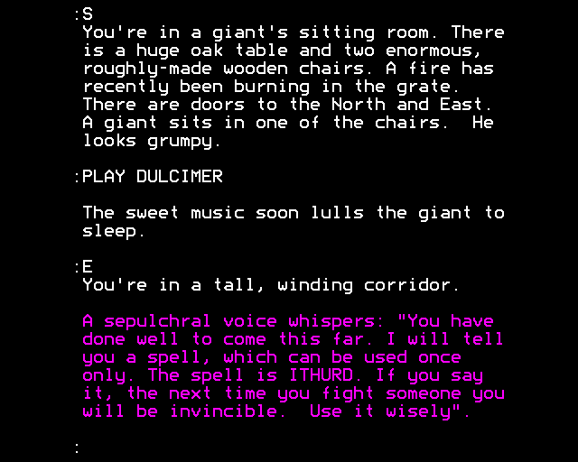 Second, the game really is forgiving in terms of transport-options. You get one magic word (GREZON) that gives you a one-shot teleport back to the treasure room, MINH works on two parts of the map, and if all else fails you can just walk (again, darkness is ok!)