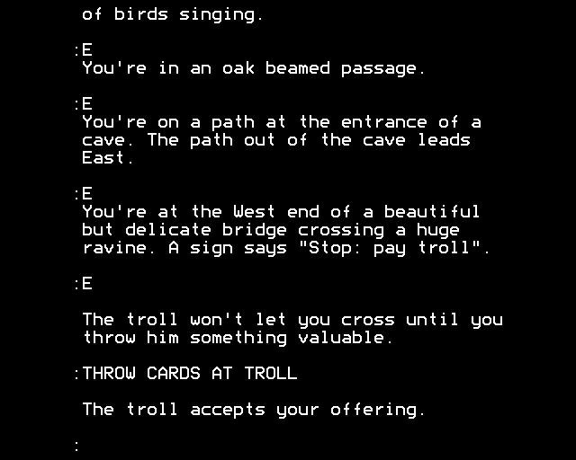 Just past the beanstalk, exactly like Crowther/Woods, there is a door that needs oil. Going even farther, there’s a troll demanding a treasure, although we finally have one deviation, since I haven’t found the FEE/FIE/FOE/FUM eggs and I’m not sure how to toss a treasure to the troll without losing it. I can still preview the rest of the map, though.